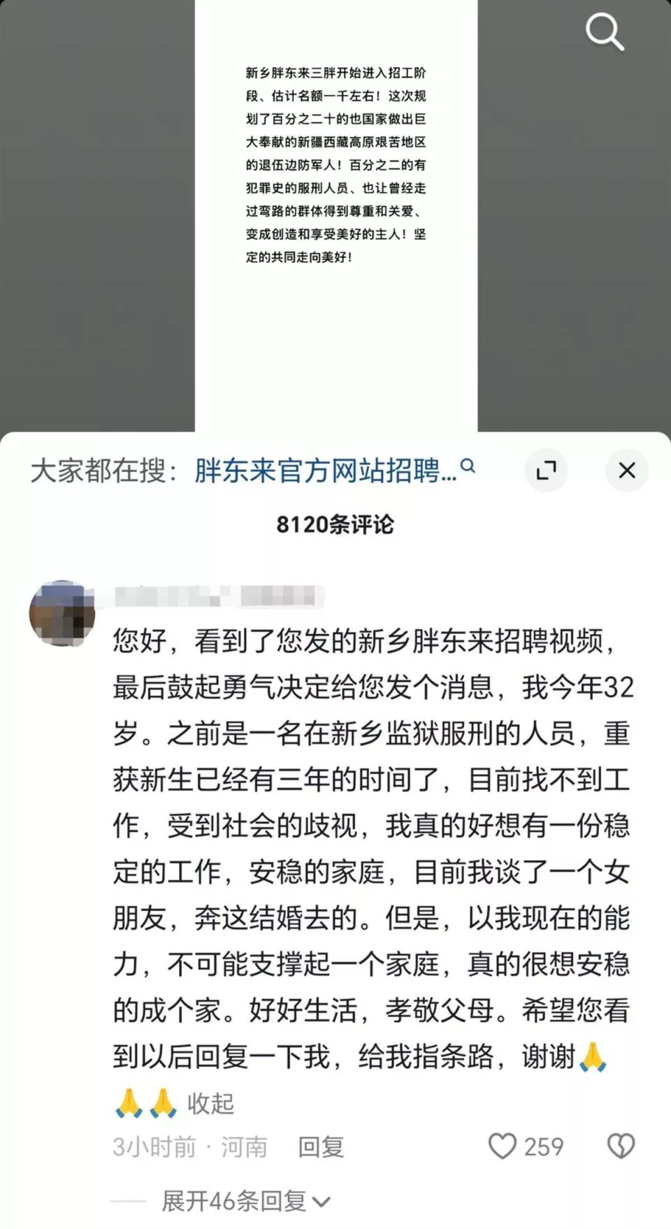 8月8日,胖东来创始人于东来在其社交平台发文称,新乡第三家胖东来(下称“三胖”)开始进入招工阶段,估计名额1000人左右,这次规划了200个名额给退伍边防军人。值得注意的是,其中还规划了20个岗位给有犯罪前科的人员。当天,胖东来计划“招20名刑释人员”登上热搜第一,不少网友涌入于东来社交账号的评论区自荐。