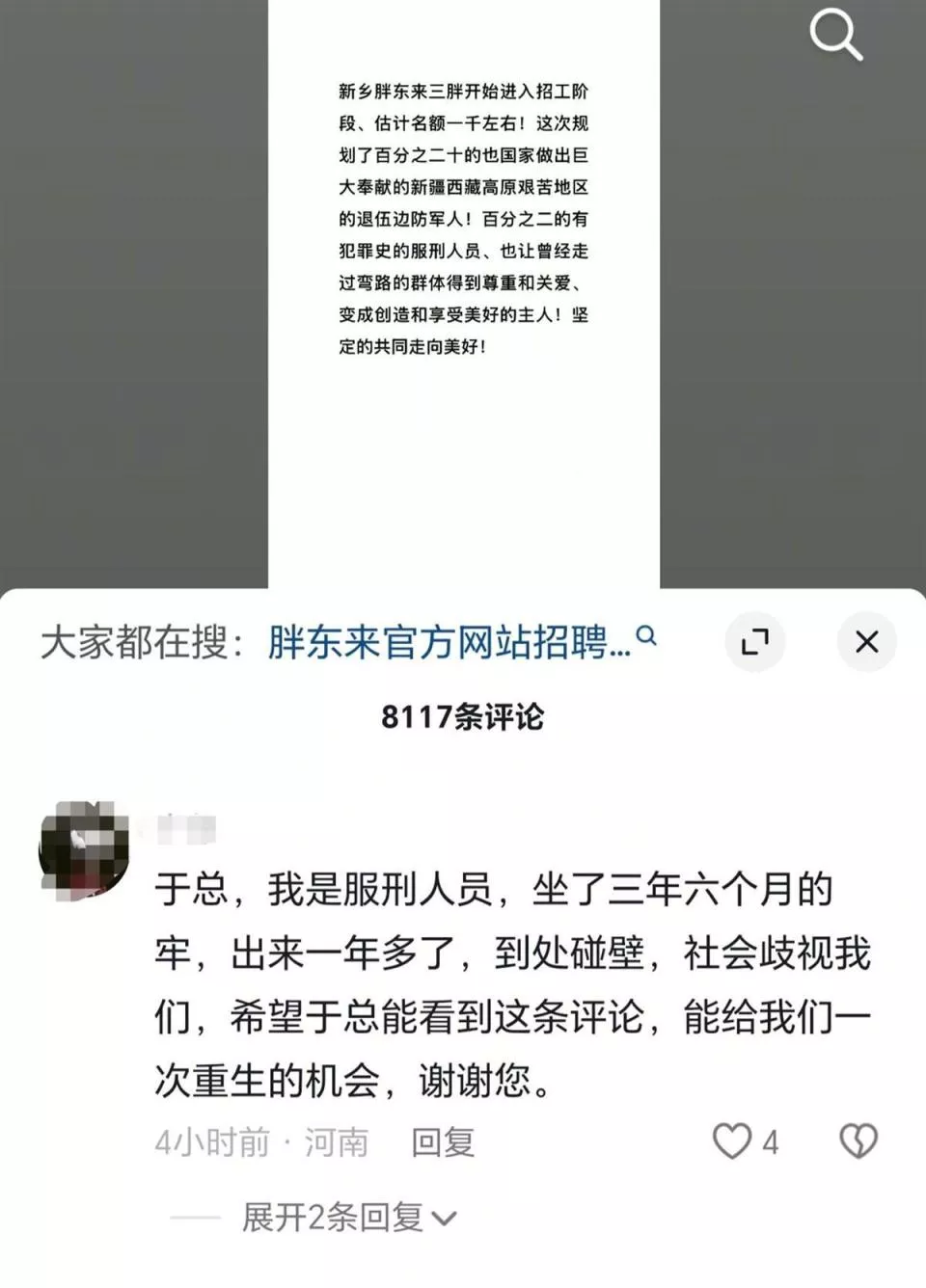 于东来在发文中表示,此次招聘规划了20%的岗位给为国家做出巨大贡献的新疆、西藏高原艰苦地区的退伍边防军人,还规划了2%的岗位给有犯罪史的服刑人员,是想让曾经走过弯路的群体得到尊重和关爱,变成创造和享受美好的主人,“坚定地共同走向美好!”有不少网友在评论区毛遂自荐,发布了个人经历和图片,截至发稿时,评论条数已超8000条。