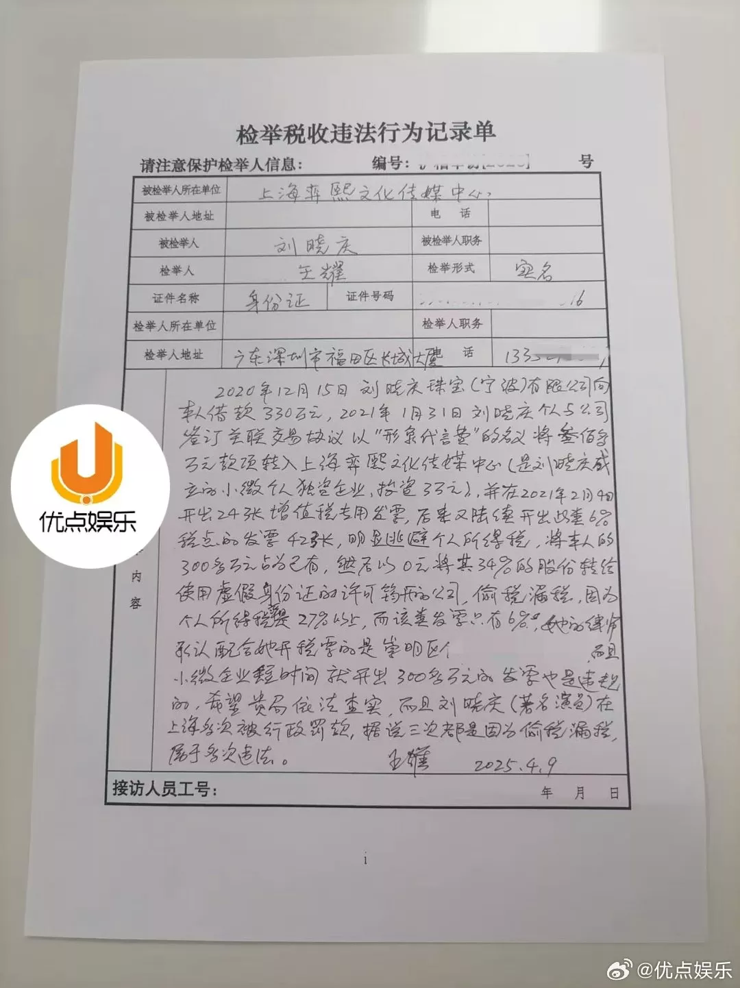 王先生实名举报刘晓庆偷税漏税。(优点娱乐)