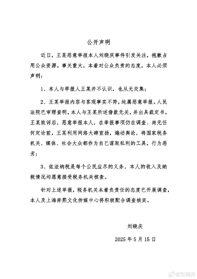 通报指,近期,该局对王某举报刘某庆(即刘晓庆)及相关企业涉税违法事项依法进行了核查。经查,未发现举报所反映的涉税问题。税务部门将依法加强税收监管,持续优化服务,促进合规经营、诚信纳税。