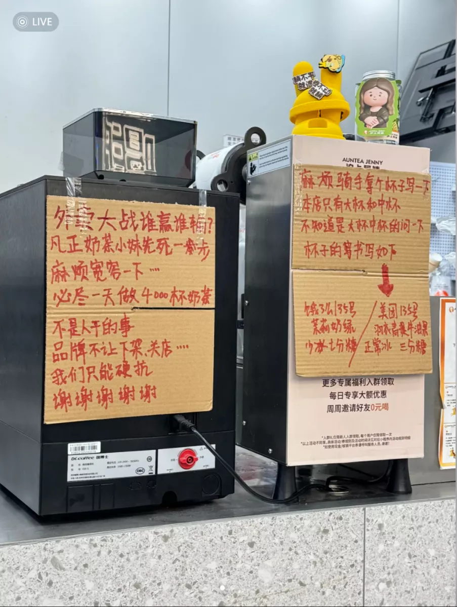 “外卖大战谁赢谁输?反正奶茶小妹先死一步,麻烦宽容一下…毕竟一天做4000多杯奶茶不是人干的事,品牌不让下架、关店…我们只能硬抗……”