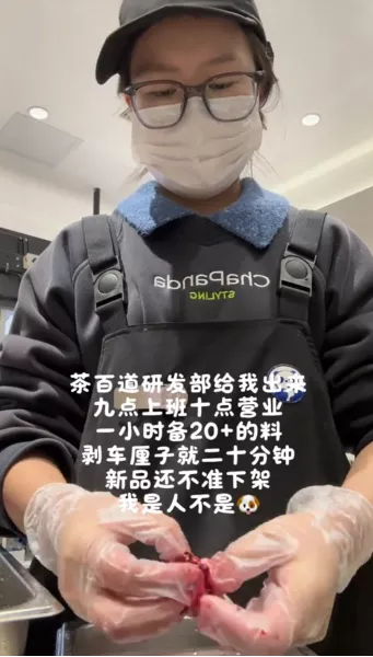 “周末快乐,除了茶百道研发部。能干干,不能干换人,整天搞各种水果汁子。要不是找不到合适的工作……每天剥八、九十斤荔枝,手都磨烂了,真把员工当日本人整呢,顾客催完骑手催……”