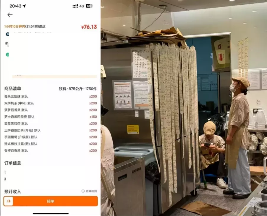 茶饮店员工看着订单绝望的背影。