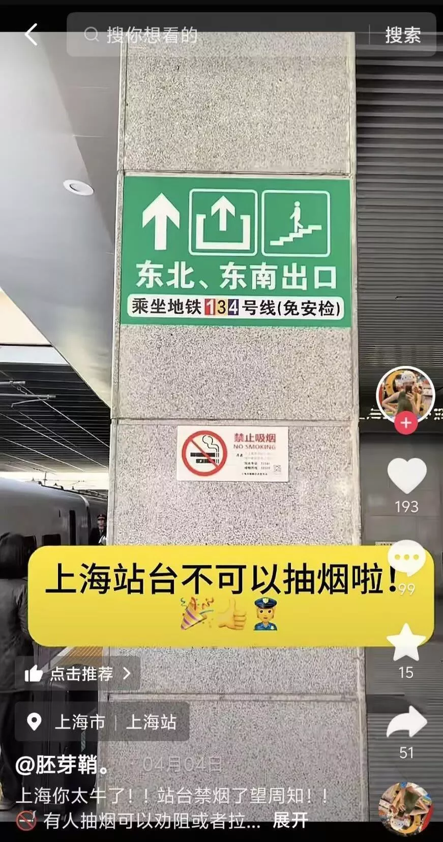 不少网友认为,相比在高铁车厢内闻泡面的味道,他们更难接受的是,在高铁站台等车时,旁边有乘客在站台吸烟。有网友评论认为,吸烟的危害更大,旅客在站台抽烟,也会影响环境和身体健康。也有网友表示,旅客在站台吸烟,自己受到二手烟影响,建议在站台边等候列车处也禁止吸烟。有网友发布的视频显示,高铁列车在一些车站停留时间较长时,确实有烟瘾较大的乘客下车吸烟。还有乘客在站台等车时,也会吸烟。