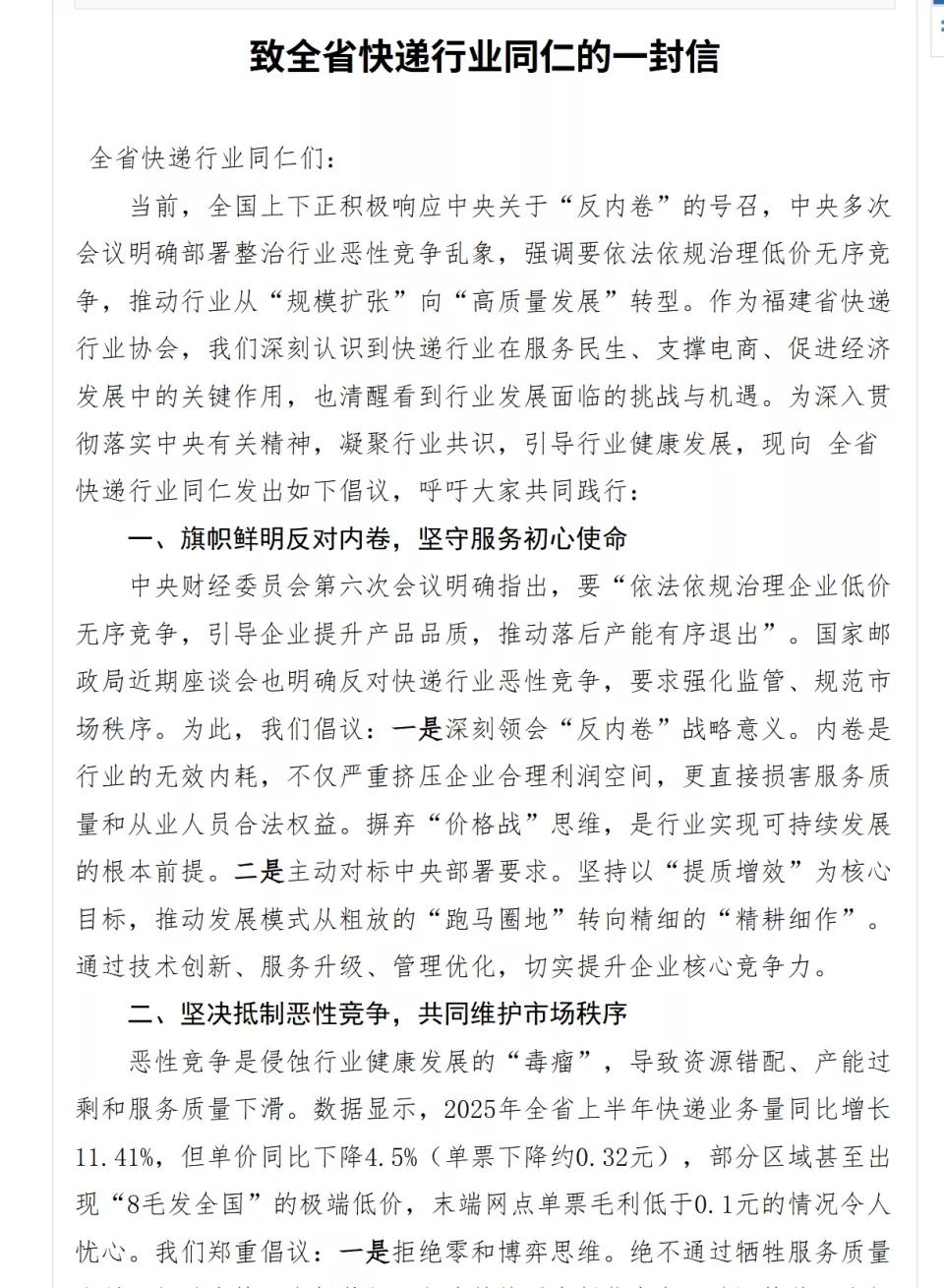 7月30日,福建省快递行业协会发布的公开信中便指出,2025年全省上半年快递业务量同比增长11.41%,但单价同比下降4.5%,部分区域甚至出现“8毛发全国”的极端低价,末端网点单票毛利低于0.1元的情况令人忧心。