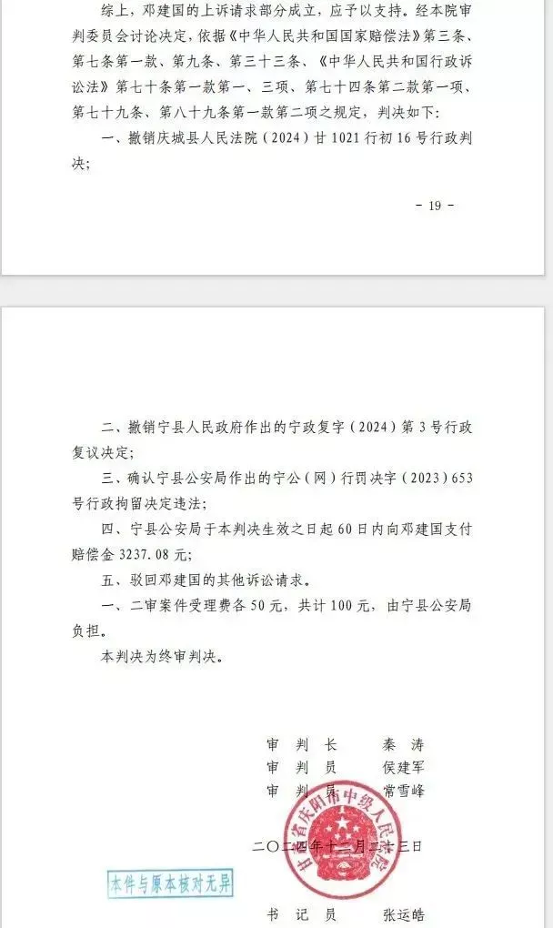 宁县公安局认定,邓建国“无相关证据情况下发布不实视频,引起网友转发,造成公共场所秩序混乱”,行政拘留7天。