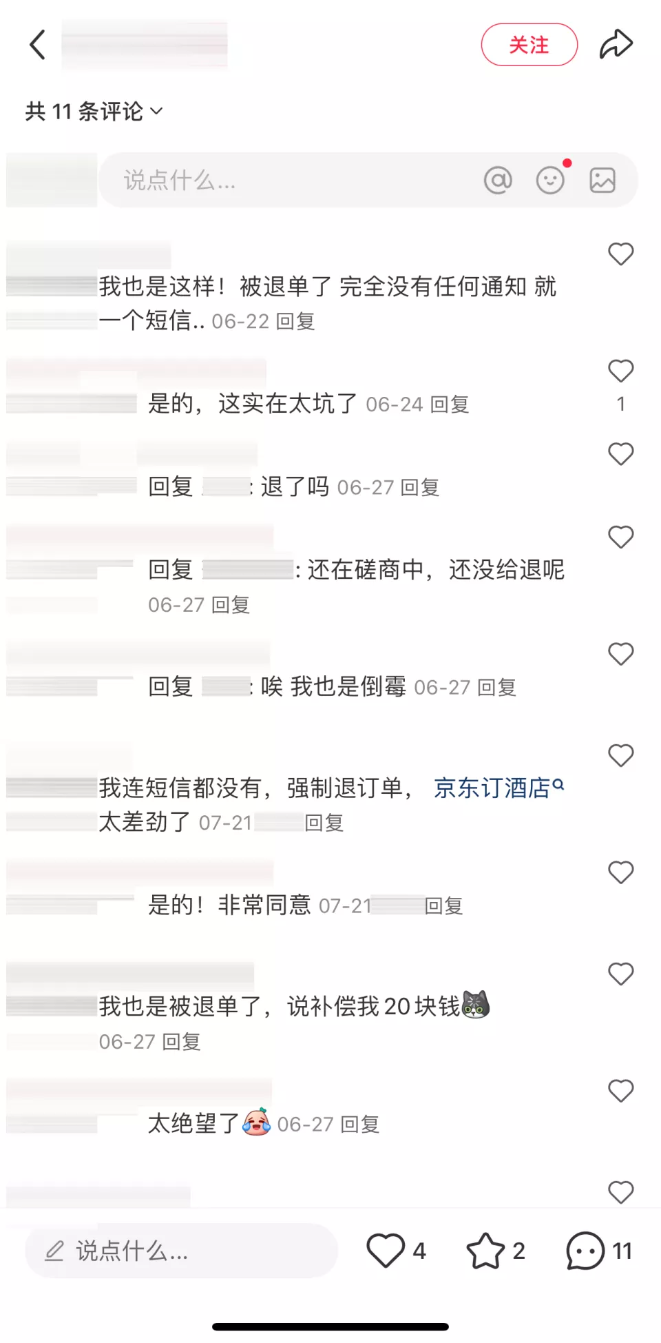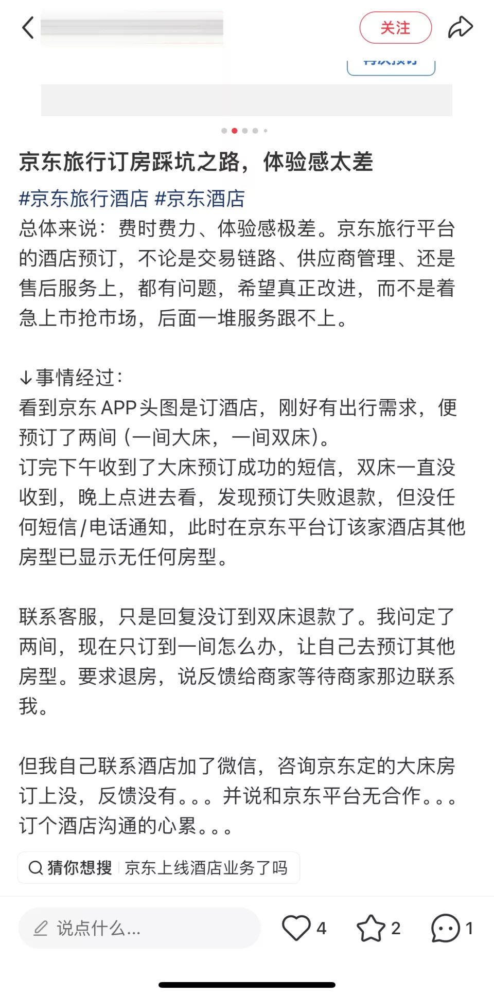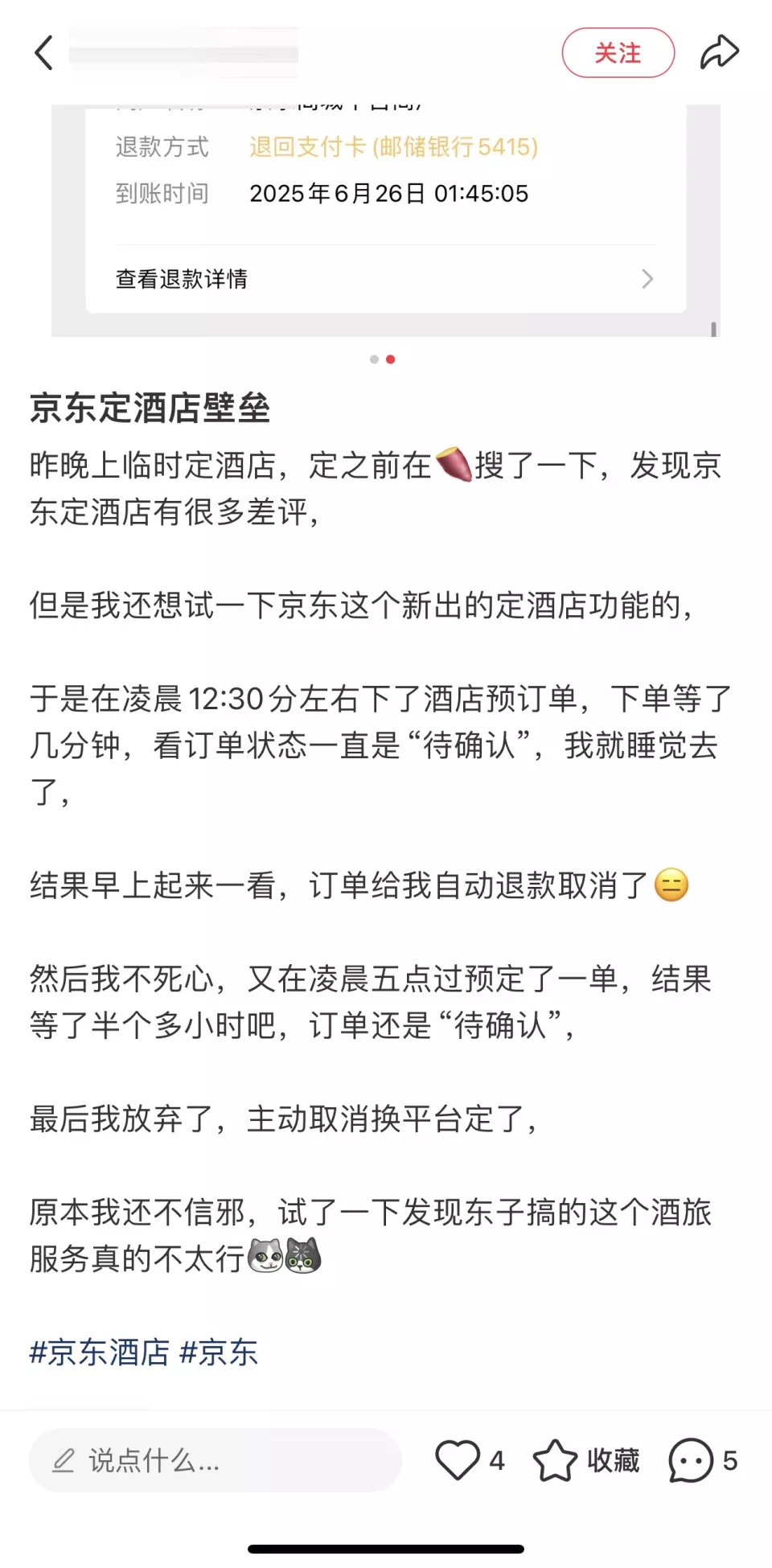 与外卖业务相比,京东酒旅业务面临的挑战更为严峻。社交平台上避雷京东订酒店之类的帖子开始增多,一些消费者反映遭遇自动退款、体验感差等问题。