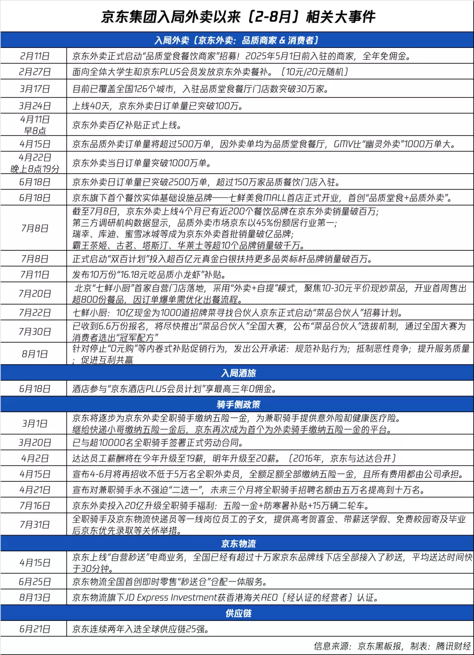 第一板斧瞄准品质商家招募和餐饮供应链创新。2月11日,京东外卖启动“品质堂食餐饮商家”招募计划,承诺5月1日前入驻的品质堂食商家全年免佣金。截止8月14日,入驻品质商家已超150万家。在618前夕的内部分享会中,刘强东透露了这一核心逻辑:“前端卖饭菜我可以永远不赚钱,靠供应链赚钱是可以的。”