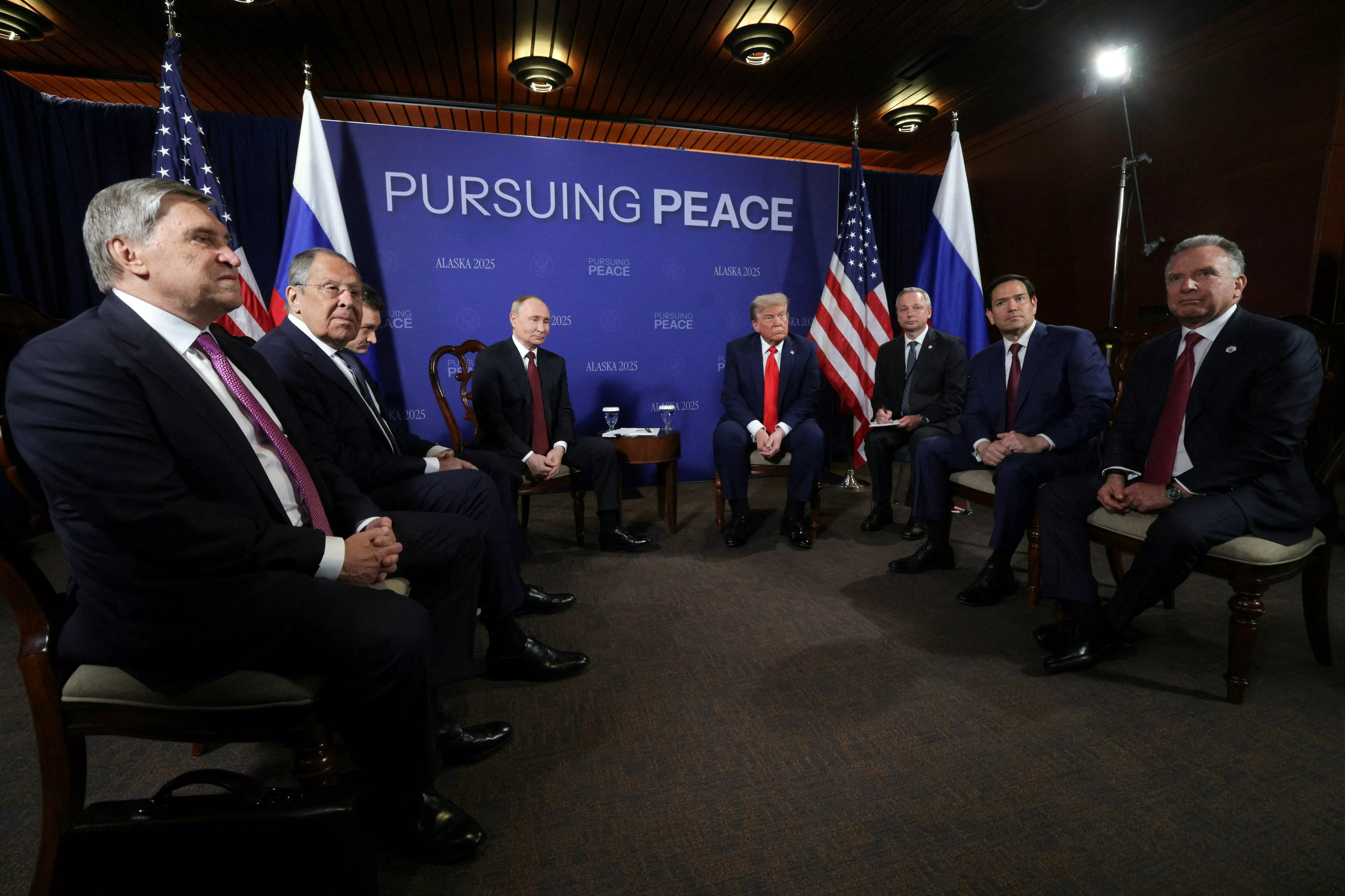 川普和普京会面有两国高层参与:俄罗斯一方是外长拉夫罗夫(Sergei Lavrov,左二)、曾任驻美大使的俄罗斯总统外交助理乌沙科夫(Yuri Ushakov,左一),美国一方则是国务卿鲁比奥(Marco Rubio)、川普多年好友兼中东特使威特科夫(Steve Witkoff)。(Reuters)