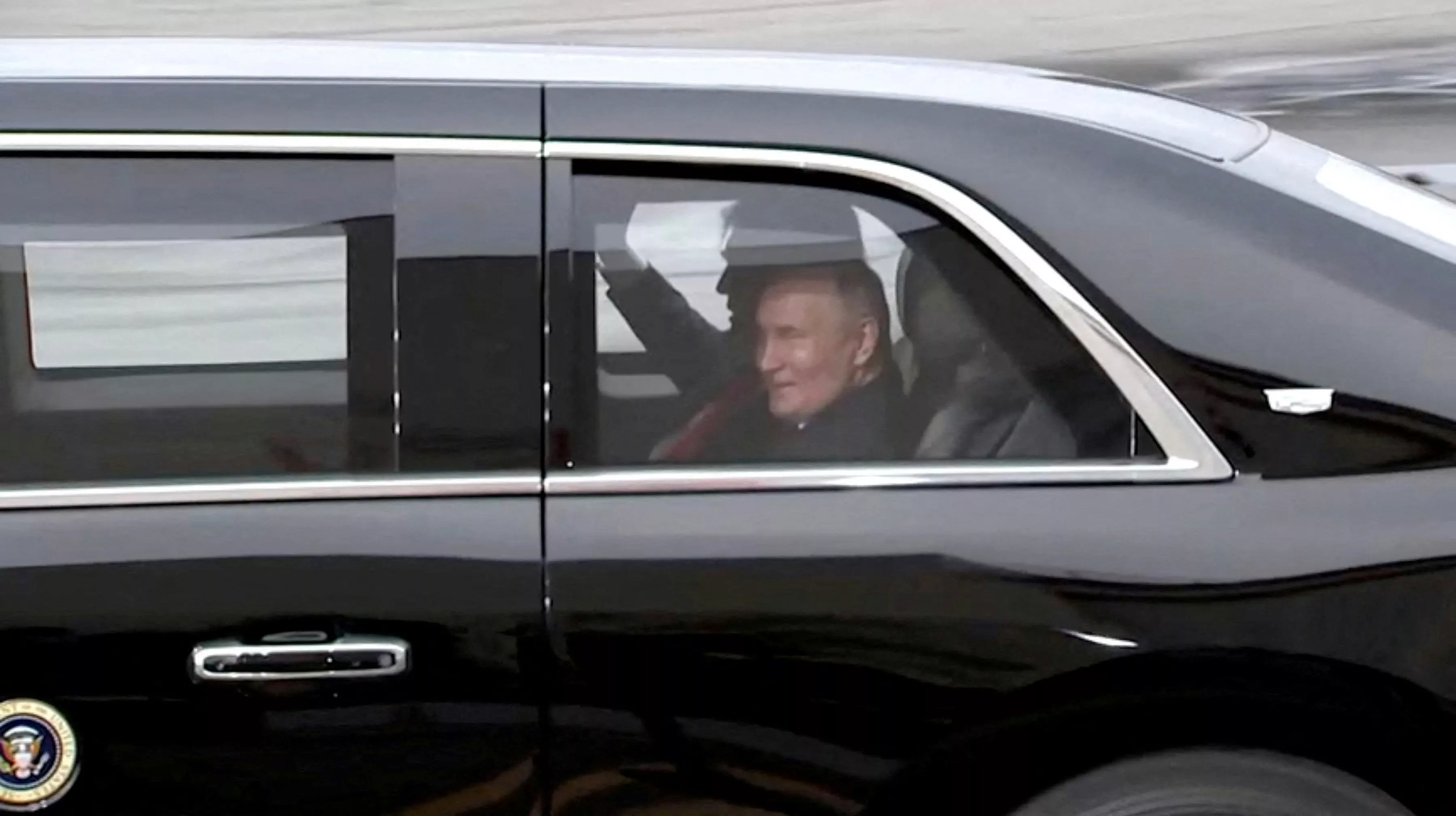 2025年8月15日,美国阿拉斯加州安克雷奇市,美国总统川普(左)和俄罗斯总统普京(右)一同乘搭美国总统专车前往峰会会场。(Reuters)