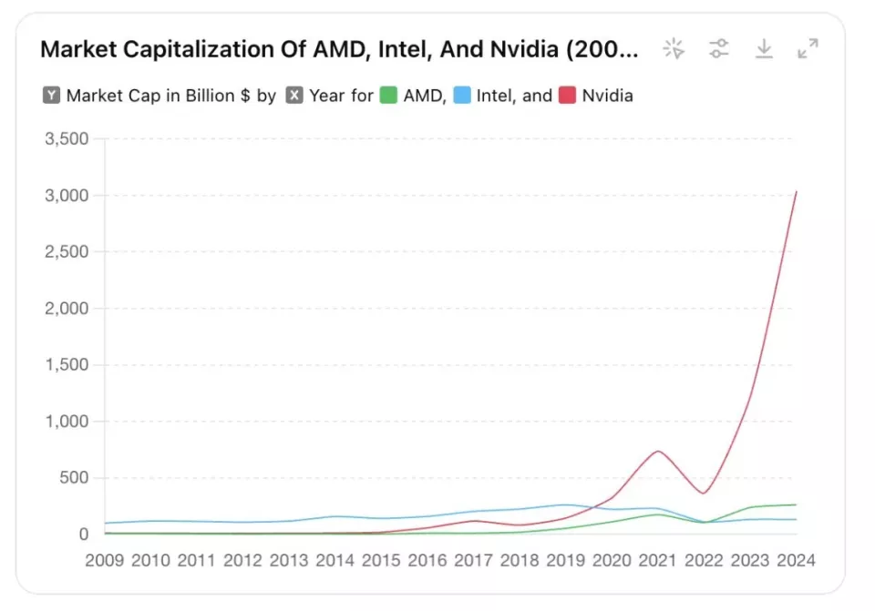 但如今,格局已天翻地覆:英伟达市值是英特尔的40倍,连曾经为了应对反垄断调查留着的小弟AMD,市值也接近其三倍,今年更在数据中心业务营收上完成对英特尔的超越。