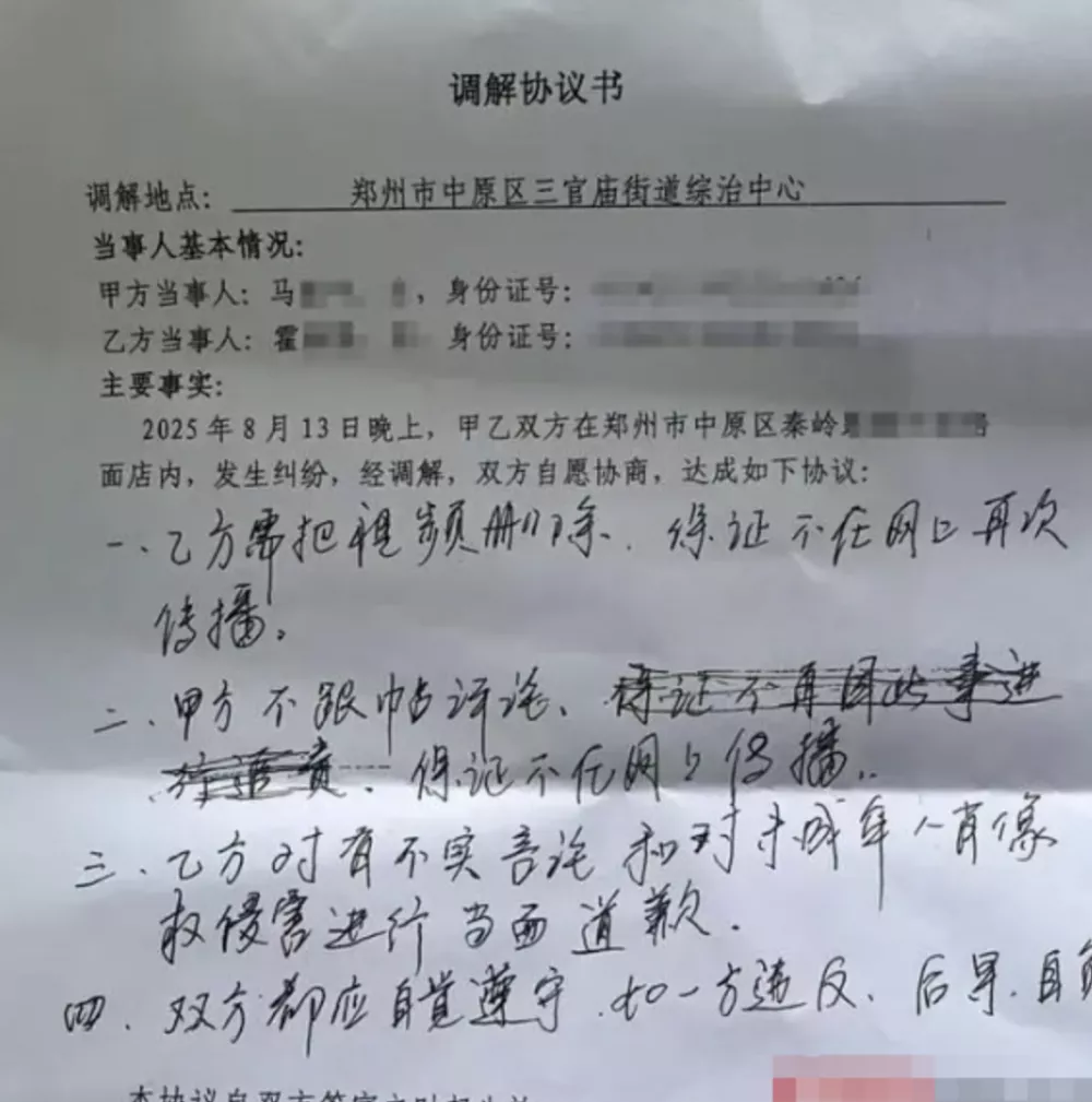 新京报记者了解到,双方就“续面、差评”一事,于8月15日,在饭店所属辖区的三官庙街道办的调解下,达成和解协议。协议书显示,双方达成协议:商家把视频删除,保证不在网上再次传播。对不实言论和对未成年人肖像权侵害进行当面道歉。同时,涉事顾客发布在社交平台的店铺差评内容进行删除,保证不在网上传播。