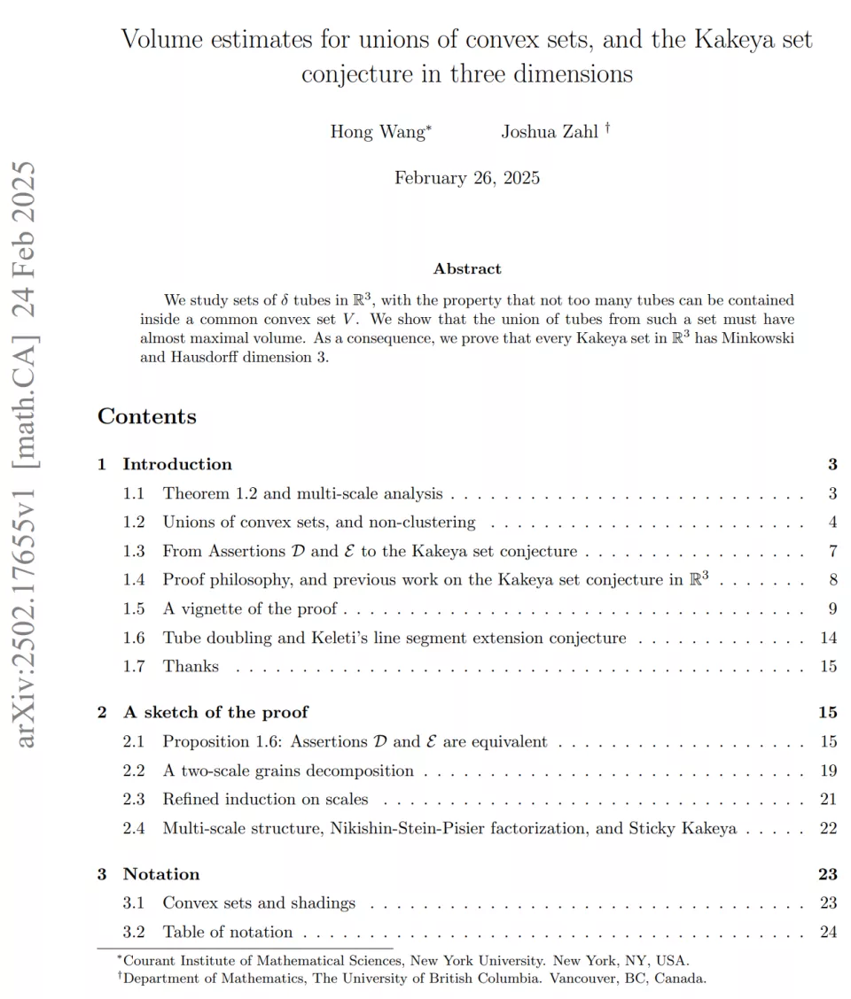 ■困扰了全球数学家107年的挂谷猜想,就是如何以尽可能小的空间旋转一根针的问题,而王虹和搭档作者Zahl就在三维空间中证明了挂谷猜想,表明针头覆盖的体积始终是三维的。