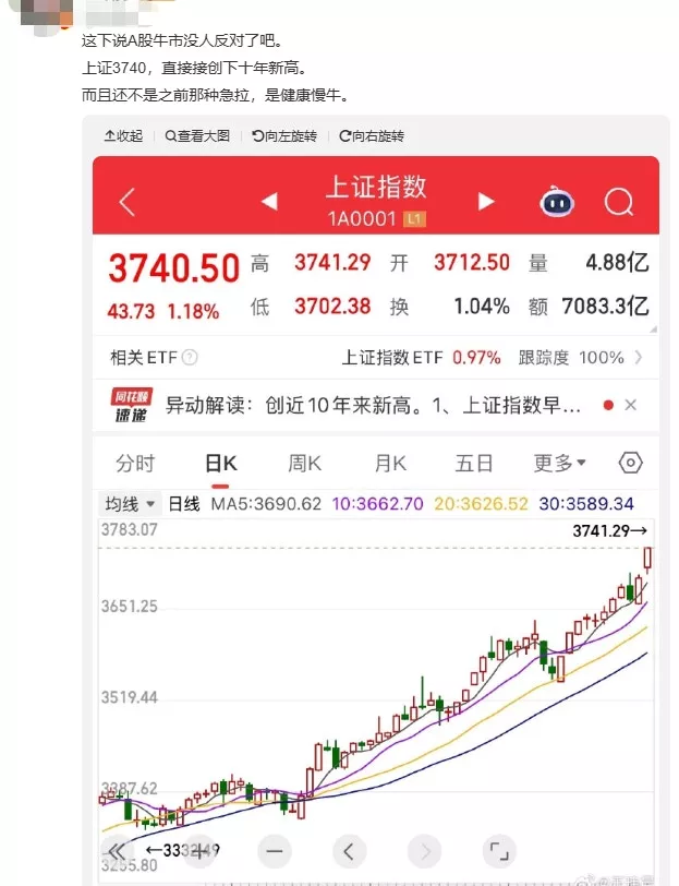 有网民认为,这次是真的“大牛市来了”,与此前资金注入急升不同,这次是健康持续增长;并期待是否能够突破4000点。还有人调侃“天下苦涨久矣”、“反正止盈还早,先开心了再说”。亦有财经KOL分析,本轮牛市自去年9月开始,到今年8月近一年时间,健康慢增长没有可参考行情,“大概率与过去都不一样”。