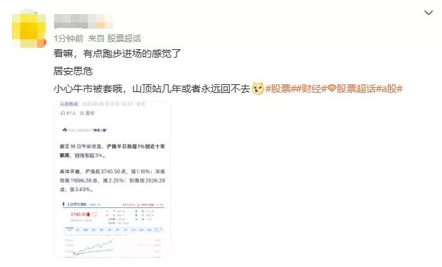 但一片激动声中,也有财经KOL面对A股飙升表示“让人心慌”;有人称“不要太疯狂了,慢慢来比较稳”;“这么疯有点拿不住了,想跑路”;“涨的有点害怕”。