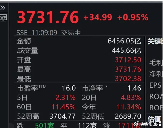 沪指突破2021年2月18日盘中创下的3731.69点高点,创下自2015年8月20日之后的新高。