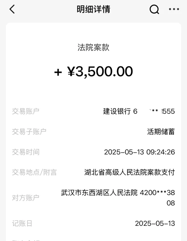 判决后房东仍拒付款项,石先生申请强制执行。2025年5月13日,3500元(押金+停业损失)直接由法院账户划拨至石先生银行卡。