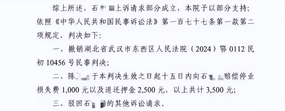 2024年12月,一审法院认为石先生“单方违约”,判决押金抵扣违约金,仅支持1000元停业损失。