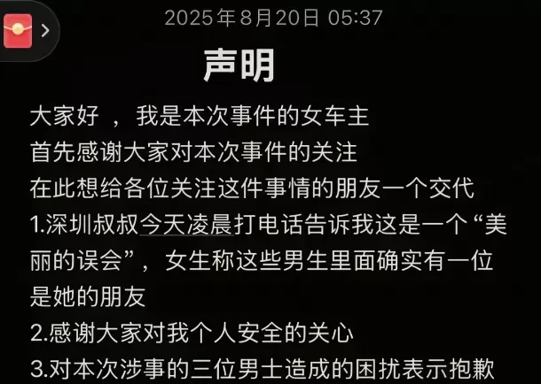 此事引发关注,冯女士再次在网上回应此事,称收到了民警的回复,称这是一个“美丽的误会”,女生称这些男生里面确实有一位是她的朋友。另据深圳媒体第一现场报道,当事女子称,是朋友准备送她回家,餐馆老板和店员扶她上车,她不愿意上车引发了误会。朋友如今气得把她微信删了。
