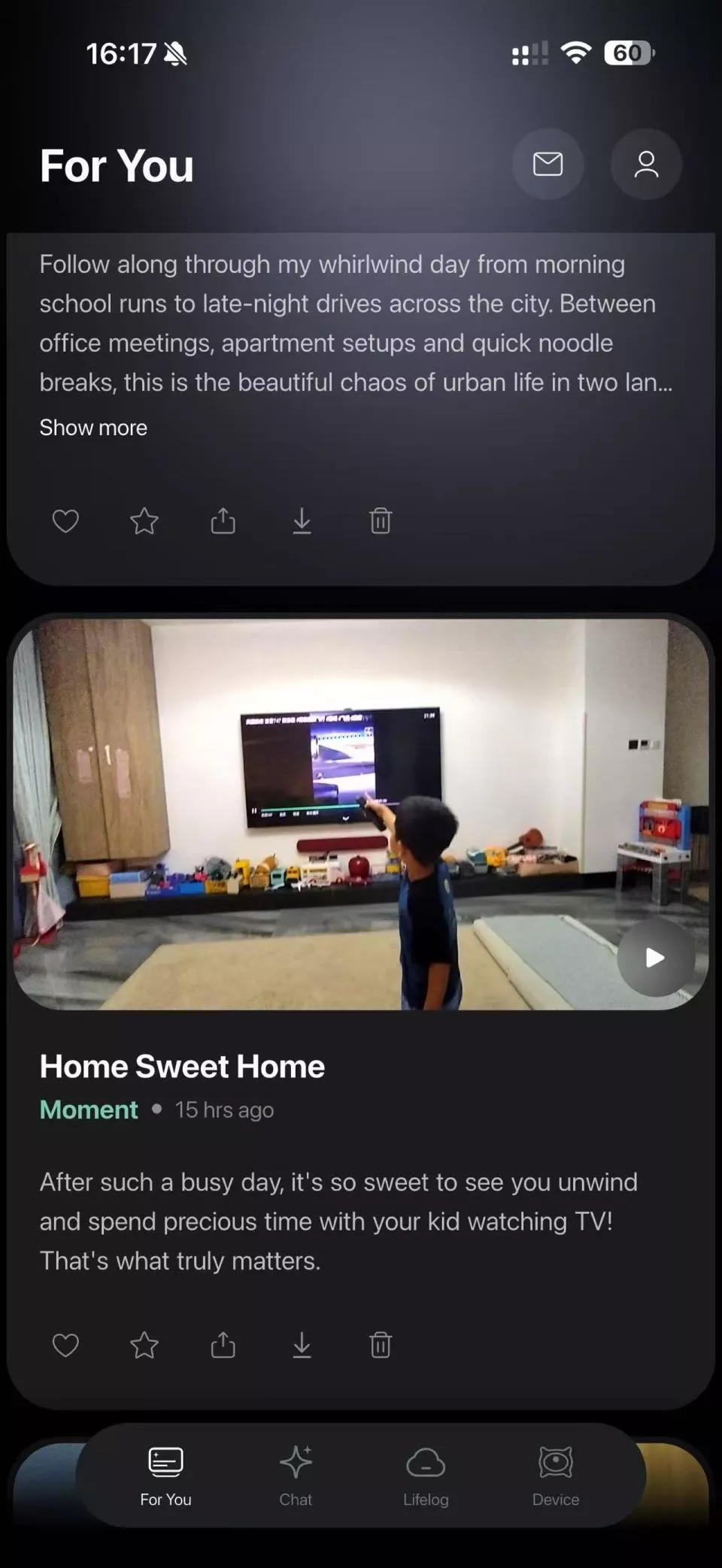 在当前的版本中,Looki会利用云端AI对这些数据进行处理。在手机App中,AI会自动将一天记录的碎片按语义分割成不同的“moments”(时刻),并打上“边开车边吃早餐”、“专注工作”、“吃面条午餐”等标签。