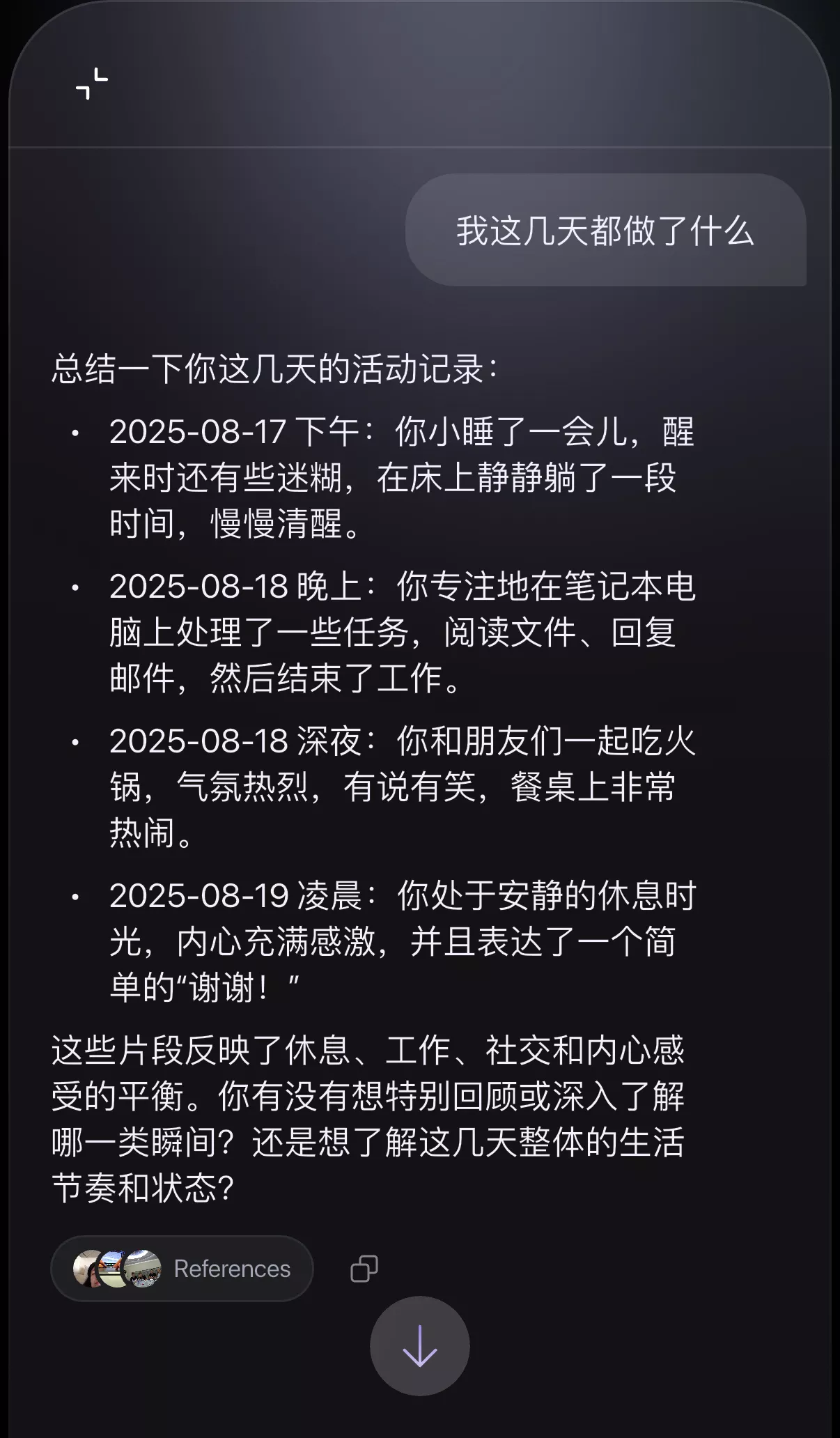 但这只是第一步。其更深层的能力,是构建了一个基于个人生活数据的AI记忆系统。用户可以像与ChatGPT对话一样,询问关于自己生活的任何问题,比如“我昨天摄入了多少卡路里?”或“我上周去了哪些地方?”