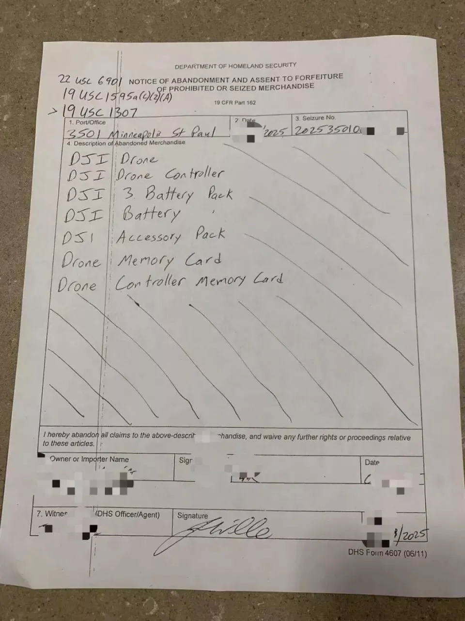 从该男子展示的表格来看,事发在明尼苏达州的明尼阿波利斯-圣保罗国际机场。被扣押的物品包括无人机、遥控器、电池以及存储卡等全套设备。下方的小字表明,这次扣押是没收的性质,不会返还给当事人。