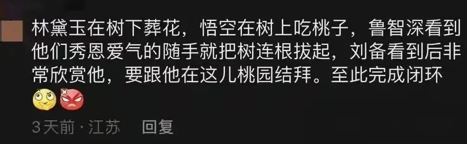 黛玉在桃树林葬花,悟空在树上吃桃子,边吃边说:“花够吗?不够俺老孙再给你摇些!”