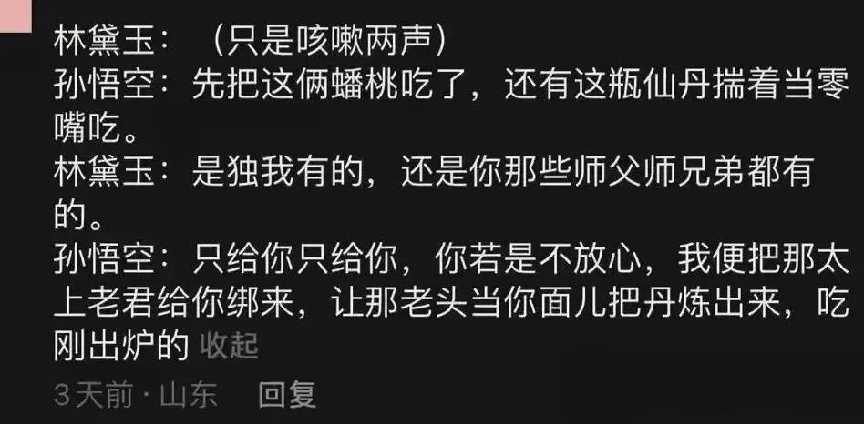 很多网友是出于好奇点进了相关话题,结果都开始沉迷于这一对奇奇怪怪又令人上头的CP了:“林黛玉是四大名著第一女主,孙悟空是四大名著第一男主,怎么不算门当户对呢?”