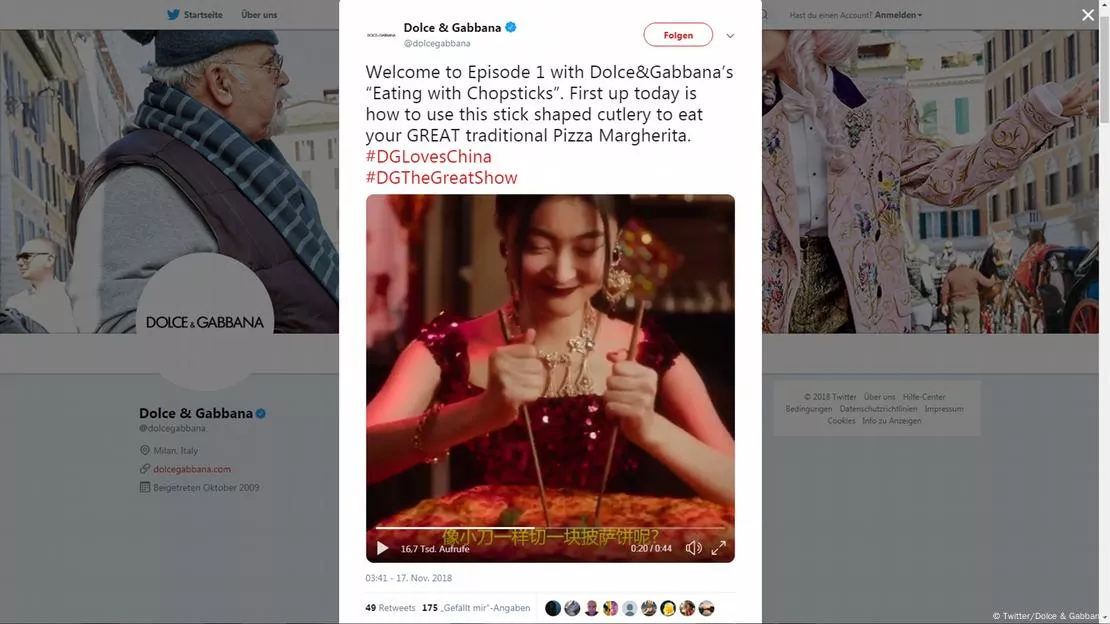2018年,时尚品牌杜嘉班纳(Dolce & Gabbana)的一则广告也曾引发“辱华”争议。图像来源: Twitter/Dolce & Gabbana