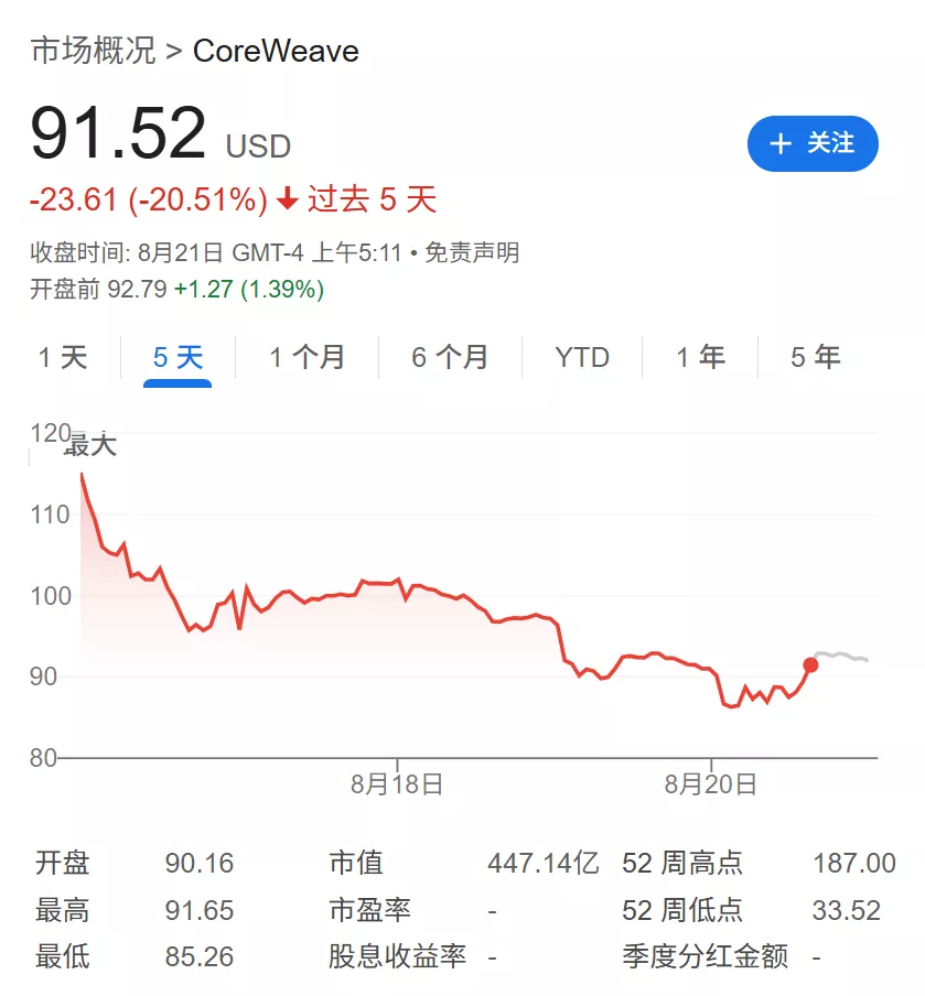 作为一家向微软和Meta等公司出租算力的AI数据中心企业,CoreWeave被视为AI领域的“纯粹标的”,其股价在过去五个交易日中暴跌了21%,显示出市场情绪逆转对该领域的集中冲击。