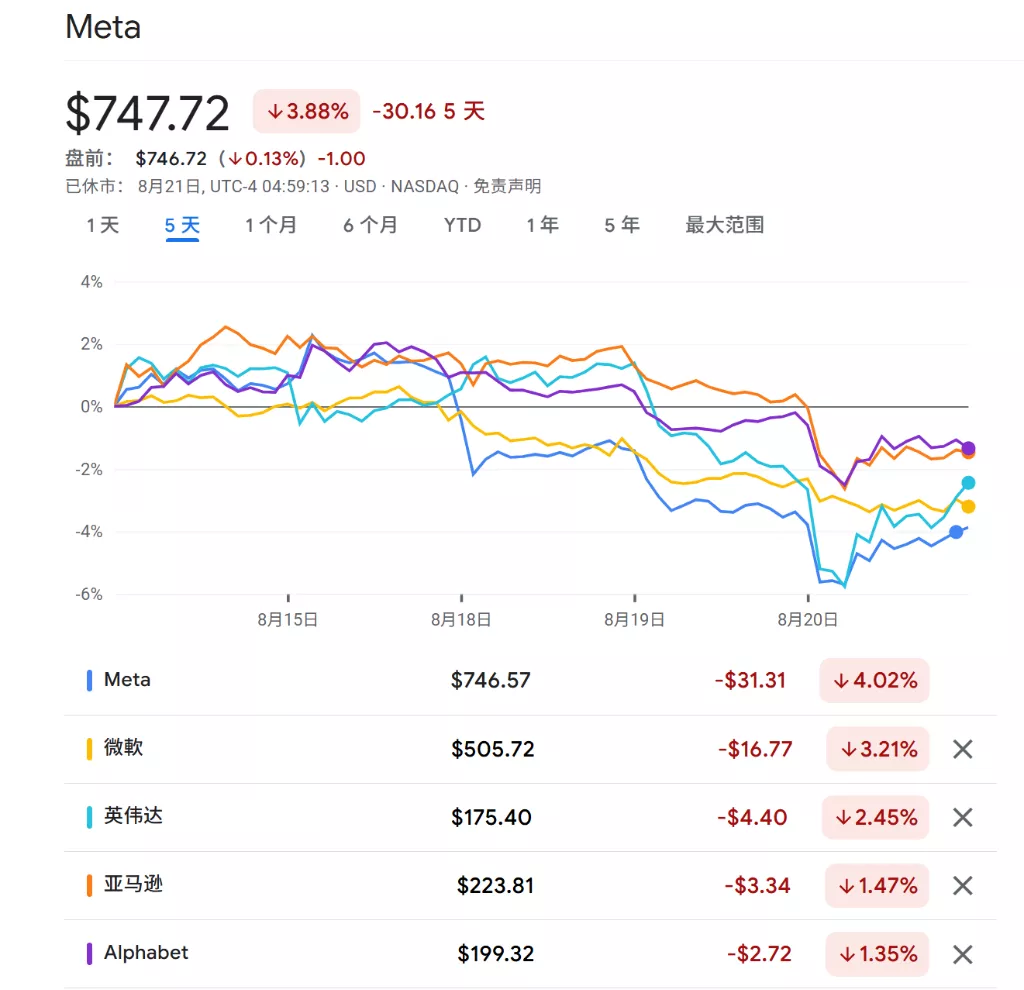 在被称为“科技七巨头”的公司中,Meta受到的冲击最大,其股价在过去五个交易日中下跌了4%。同期,芯片巨头英伟达的股价下跌了3.8%。