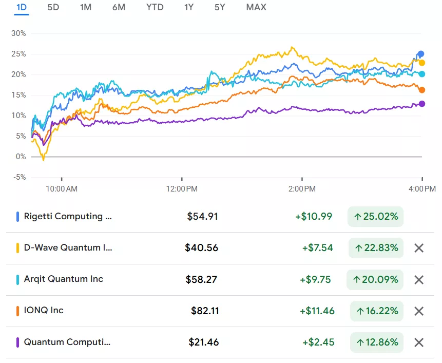 声明发布后,量子计算作为27个细分投资领域之一股价大涨。Rigetti股价周一收涨25%,D-Wave上涨23%,Arqit涨20%。IONQ攀升16%,Quantum Computing上涨12%。