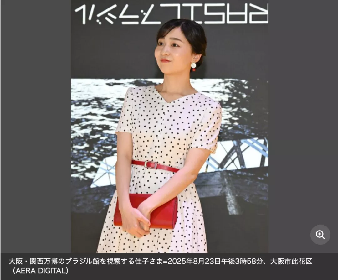 今年8月,佳子公主在关西世博会出席公务活动时,以一身波点连衣裙亮相,配以点睛的红色腰带与红色手包,清新又少女感十足,她的这套造型广受好评,同款很快就卖脱销。