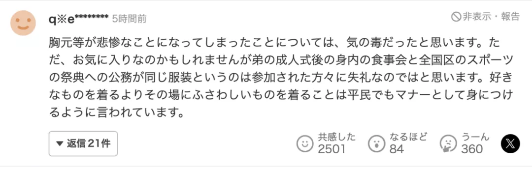 “因为穿衣不得体而引发尴尬,我觉得她蛮可怜的。但是或许她就是喜欢这样吧。她之前也在弟弟成人仪式后的私人聚会穿过,感觉蛮失礼的。相比穿自己喜欢的衣服,什么场合穿什么衣服,这对于平民而言,都是应该掌握的穿衣礼仪。”