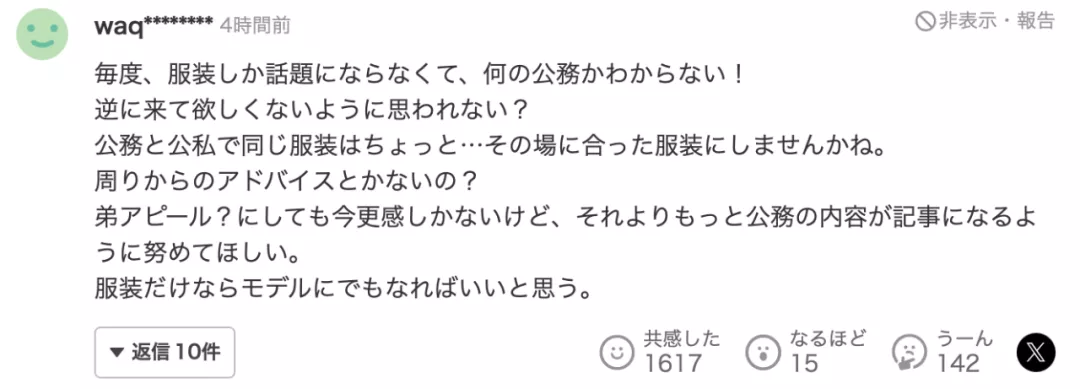 也有日本网友批评佳子公主,每次出席公务都以衣着打扮来抢头条,喧宾夺主。