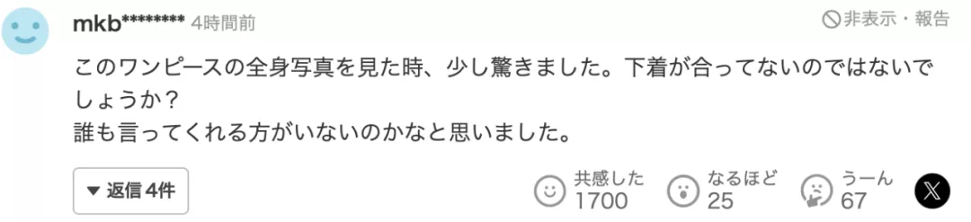 但这件连衣裙的上半身褶皱则引发争议。不少日本网友认为,一眼望过去,似乎能看到内衣的形状。
