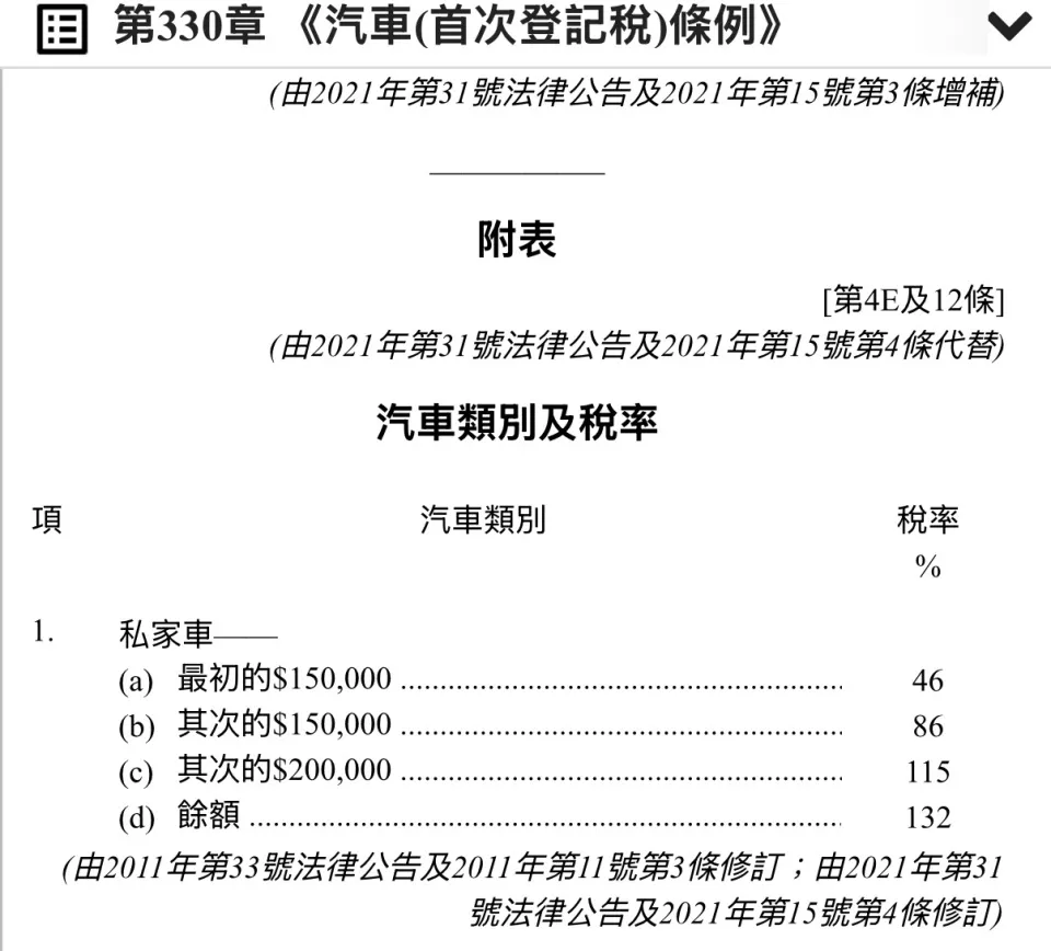 而高昂的税费也是购车压力的主要因素。在香港购车,需要缴纳首次登记税。根据香港现行规定,首次登记税按车辆应课税价值(即税前车价)梯度征收:15万港元以内的部分需缴纳46%的税率,15万至30万港元的部分税率升至86%,超过30万港元的部分税率进一步提高到115%,若车辆应课税价值超过50万港元,对应的税率更是高达132%。