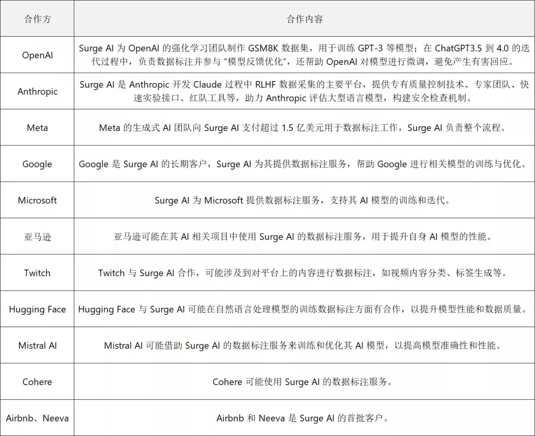 Scale AI做的生意也是给大模型企业提供数据标注和训练,被戏称为AI界的富士康,客户涵盖了OpenAI、微软、谷歌、Meta等各大AI头部公司。