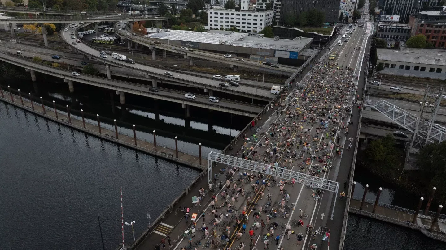 民众于10月12日在奥勒冈州波特兰市参加裸骑单车活动。(美联社)