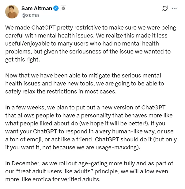 10月15日,OpenAI宣布成立一个由八名专家组成的委员会,旨在评估AI对用户心理健康、情绪与行为动机的影响。然而同一天,奥特曼却发文称该公司将放宽内容限制,两者在时间上的重合在社交媒体上引发困惑与强烈反弹。