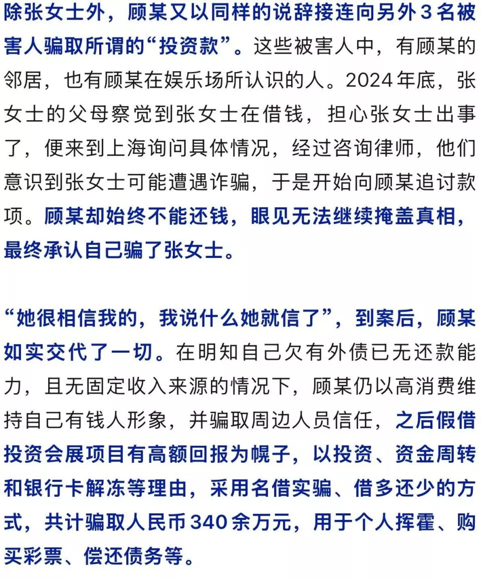 2024年6月,顾某锁定了之前在娱乐场所认识的张女士为目标,声称可以带她投资一些高端的展会项目,收益率高达30%,比上班挣钱轻松多了。张女士信以为真,当即给顾某转账10万元。一个月后,两个人确定了恋爱关系。在此期间,顾某屡次以“银行卡被冻结,需要钱解冻”“投资会展需要支付违约金、赔偿款、展会定金、设备租赁费”等理由向张女士要钱,共计骗取160万余元。为了取得张女士信任,顾某甚至用手机号注册了一个小号,自编自导了一系列有关会展投资的聊天记录给张女士看。