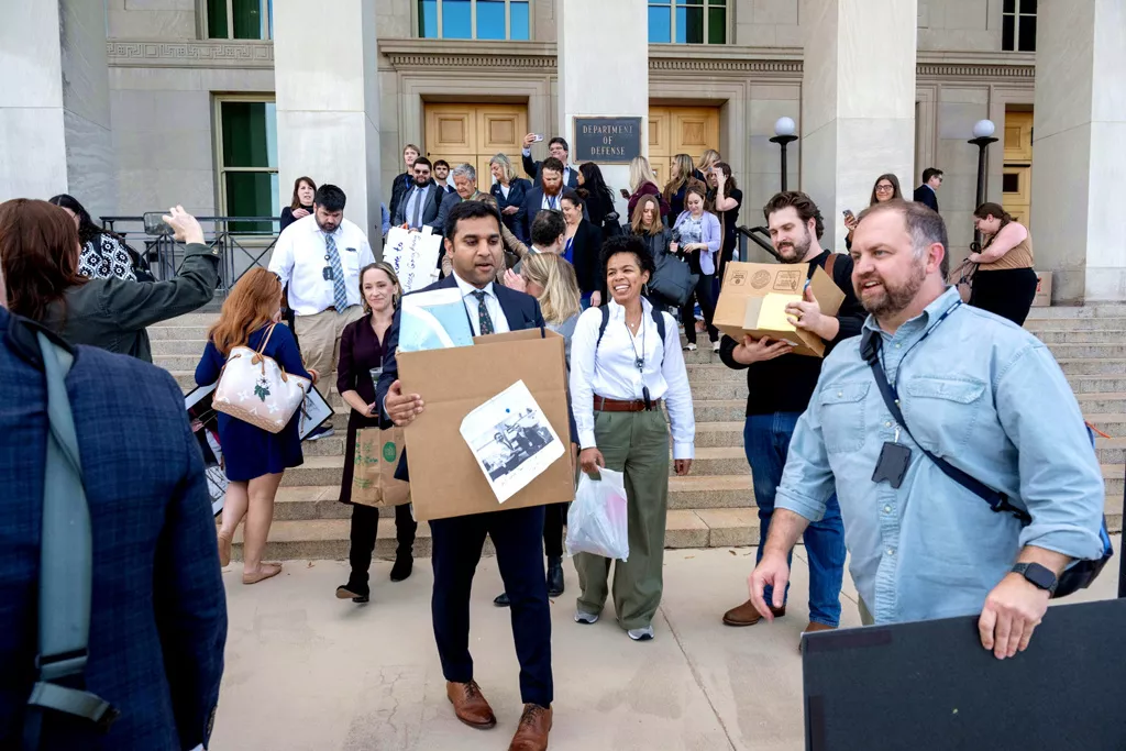 约有40至50名记者选在下午4时的最后期限一同离开。随著时间逼近,五角大楼走廊堆满文件箱,记者加紧打包,他们搬著椅子、影印机、书籍与旧照片走向停车场。