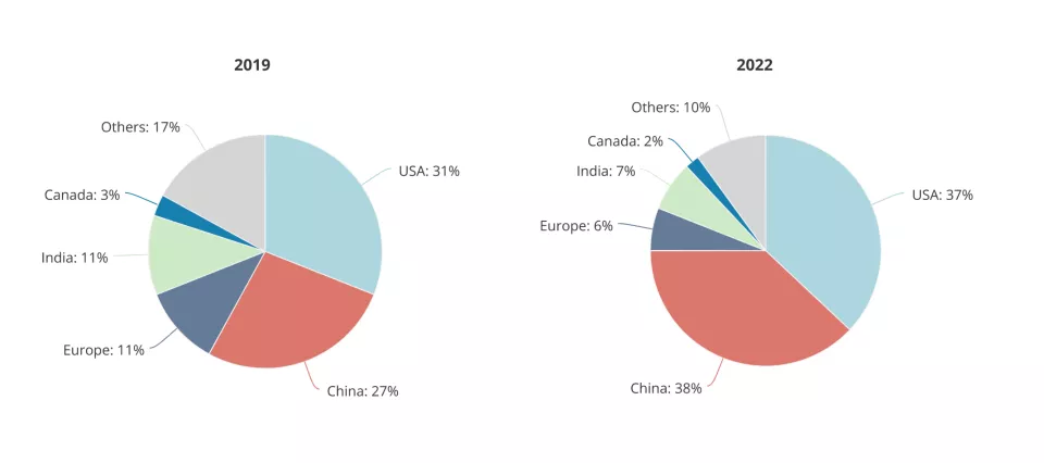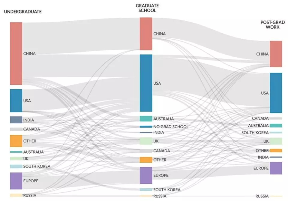 美国机构顶尖人工智能研究人员(前20%)的主要原籍国
