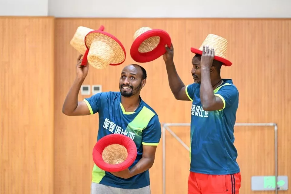 9月28日,两名来自埃塞俄比亚的学员在河北吴桥杂技艺术学校排练厅内练习帽子技巧/新华社记者牟宇摄