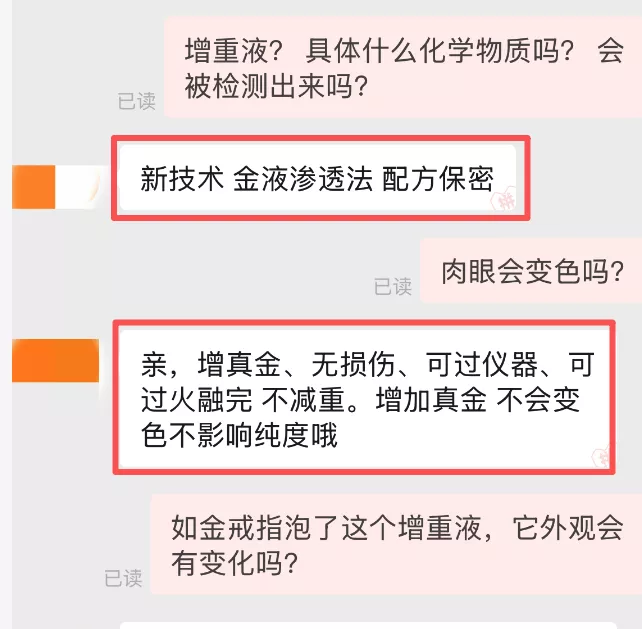10月13日,《正在新闻》记者以消费者身份联系黄金增重液商家“德威特科技”客服人员,对方称“增真金、无损伤、可过仪器、过火不减重、不变形、不影响纯度、一月内无效可退款”。当记者追问黄金增长液成分时,客服回复“新技术,金液渗透法,配方保密”。