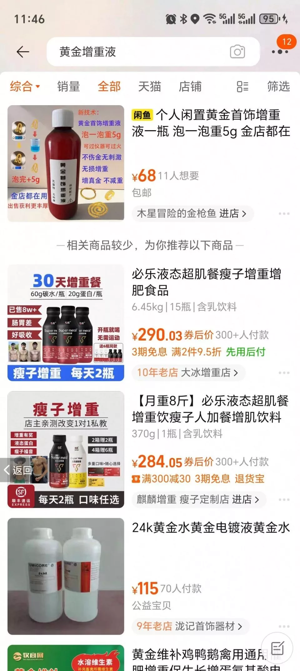 记者同时注意到,淘宝平台也有售卖“黄金增重液”相关产品,但仅有一条链接,点击进入链接后发现会跳转至闲鱼平台,相关账户为个人卖家,同样也宣称“泡一泡,黄金多5克”。记者以消费者身份尝试购买该产品,卖家回复称,暂时缺货。
