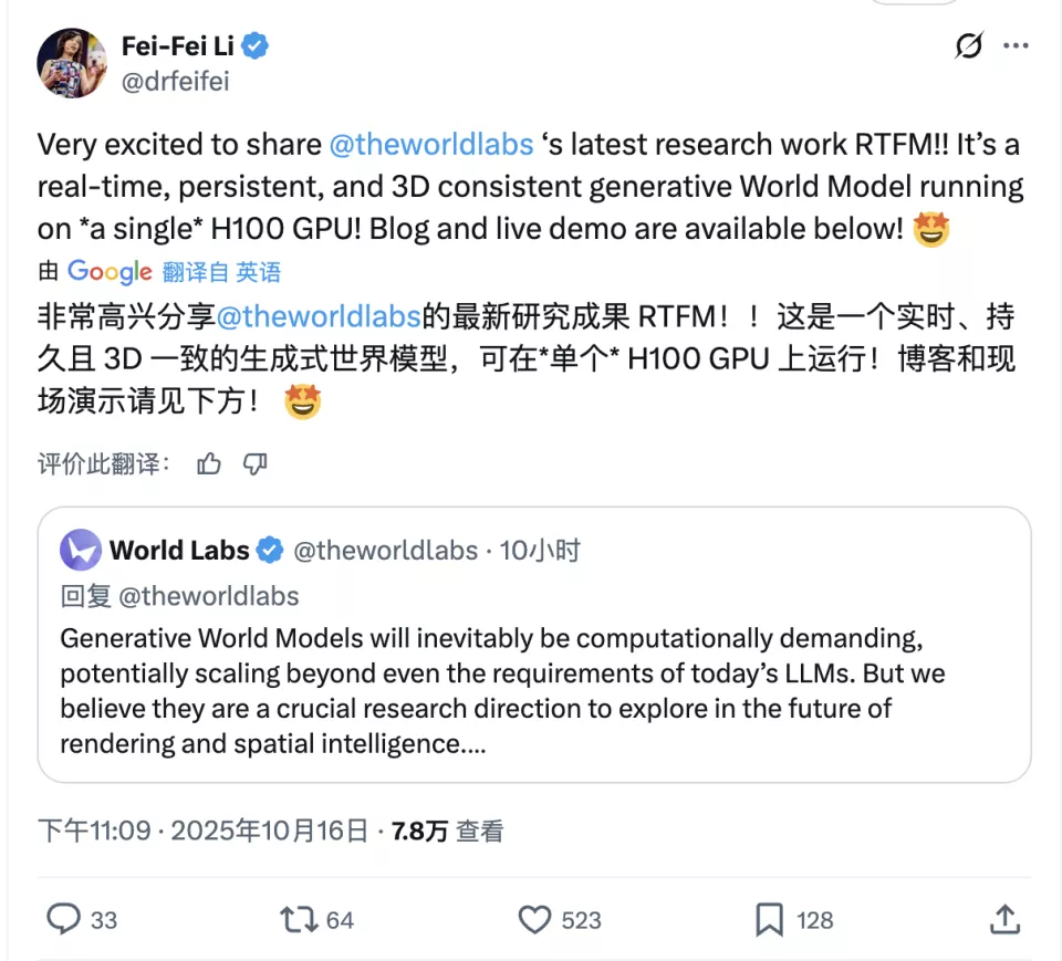 10月17日消息,李飞飞的World Labs于今晨发布全新实时生成式世界模型——RTFM(Real-Time Frame Model,实时帧模型)。