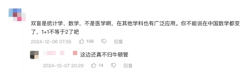 一位高中学历的自学中医宝妈,在陕西省咸阳市某县城卖瓜子为生,对“双盲对照试验”颇为不满,原因是“这是西医的标准,规则是西医定的,不公平”。