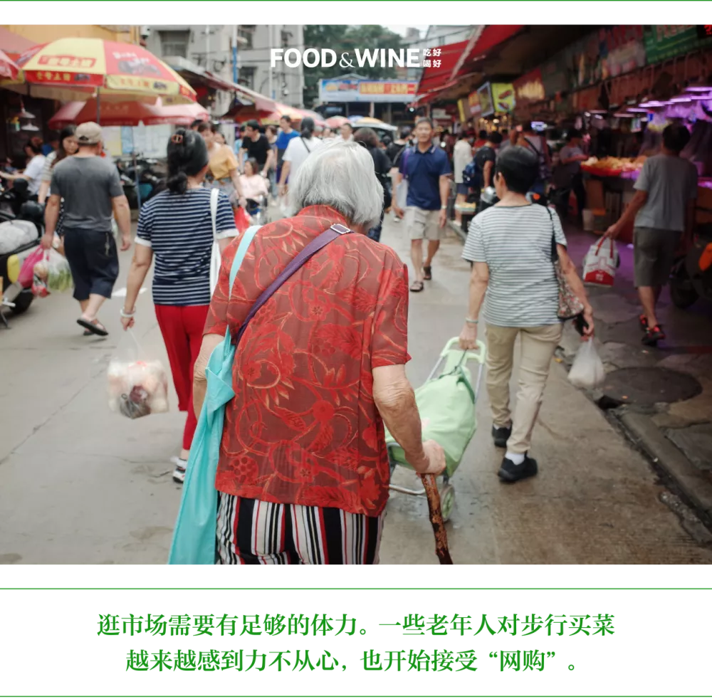 同样是沙园市场的拥趸,70 多岁的池先生和上述年轻人一样,并没有把肉菜市场当成唯一的购物渠道。池先生退休后和众多老同事一起,每天到沙园市场「赶集」。他保持老工人的作风,每天 9~10 时出发,步行来回,全程 1 小时左右,买菜和散步合二为一。随着年龄越来越大,他对步行买菜这项工作越来越感到力不从心,于是渐渐有了新选择。「一两年前开始网购,以前不知道,后来儿媳告诉我有这个渠道。有一个博主耐心地教我(社区网购),而且家所在的社区就有提货点,慢慢就习惯了网购。社区团购只是买水果、百货、早餐。现在已经很少去沙园市场买菜。」他说。