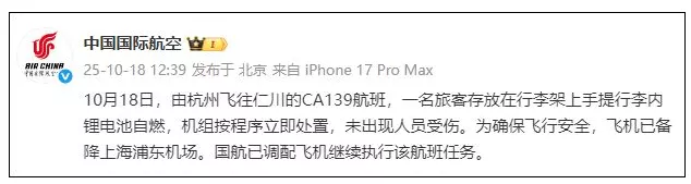 据《新闻晨报》报道,国航于18日中午12时39分发布官方情况通报称:“杭州飞往仁川的CA131航班上,一名旅客存放于行李架上的手提行李内锂电池发生自燃。机组按程序立即处置,未出现人员受伤。为确保飞行安全,飞机已备降上海浦东机场。国航已调配其他飞机继续执行该航班任务。”